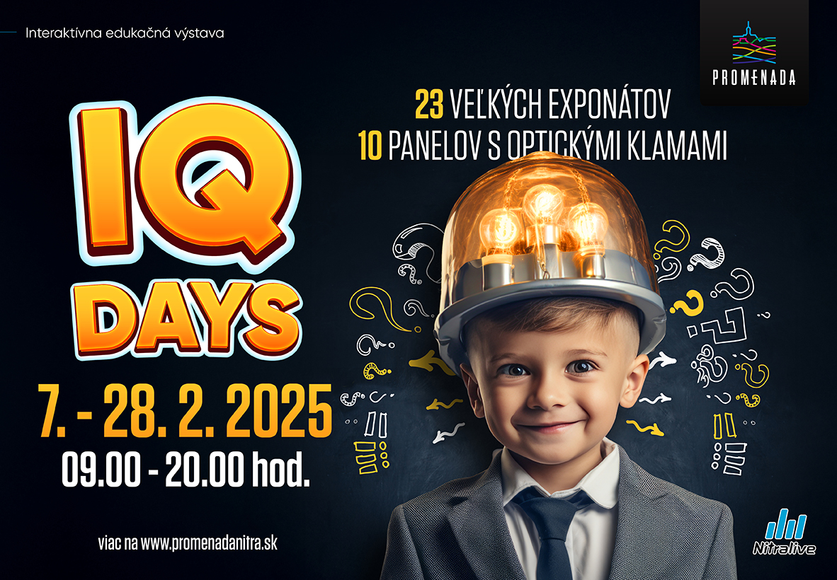 Chcete sa niečo naučiť i dozvedieť a popritom sa zabaviť a zasmiať? Vychutnávať si okamihy radosti z poznávania a netrpieť pritom memorovaním? Práve takéto kúzelné okamihy, kedy sa škola stáva hrou, prináša interaktívna výstava IQ DAYS, ktorá do Nitry zavíta po prvýkrát v dňoch 07.02.-28.2.2025 a ktorá svojim malým aj veľkým návštevníkom priblíži vedu nevtieravou formou a hravým spôsobom. Výstava, obsahujúca 23 veľkých exponátov a 10 panelov s optickými klamami, je rozdelená na 3 tematické celky a všetkým ponúka kopec nových poznatkov získaných v praxi, ako aj preverenie si množstva a kvality znalostí a zručností, získaných v škole. Jej exponáty môžu využiť deti i dospelí a je vhodná nielen pre individuálne návštevy, ale i pre celé rodiny a školské kolektívy. Všetkým návštevníkom ponúka zábavu, ponaučenie i zážitok z poznávania a slúži aj ako skvelá pomôcka pri výučbe fyziky, matematiky, prírodovedy a chémie.